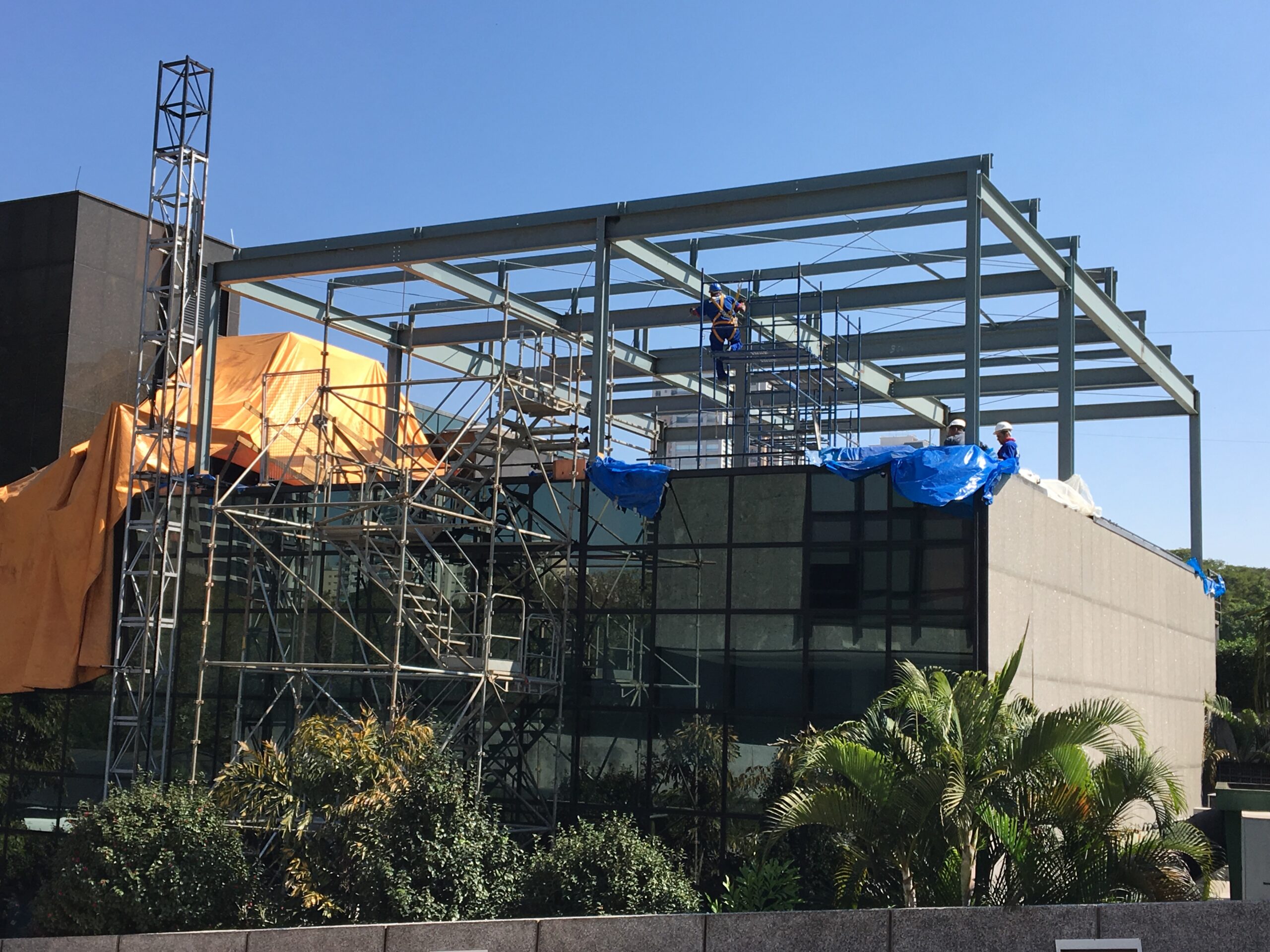 Fomos responsáveis pela fabricação e montagem das estruturas metálicas da cobertura e sustentação da pele de vidro para a ampliação da academia do clube.