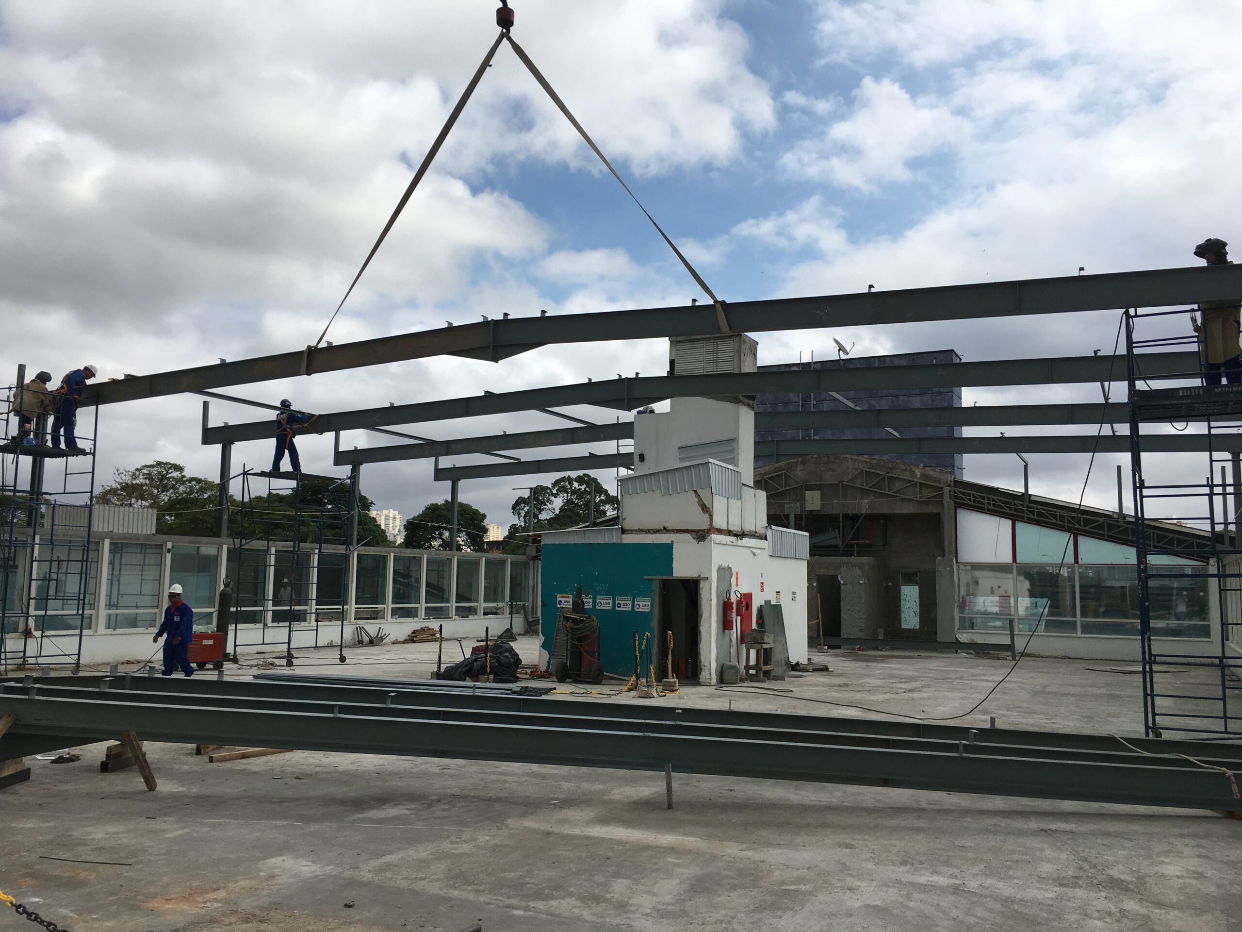 A execução foi facilitada pela possibilidade de utilização de guindaste e pelo uso de perfis de alma cheia, o que agilizou o processo.