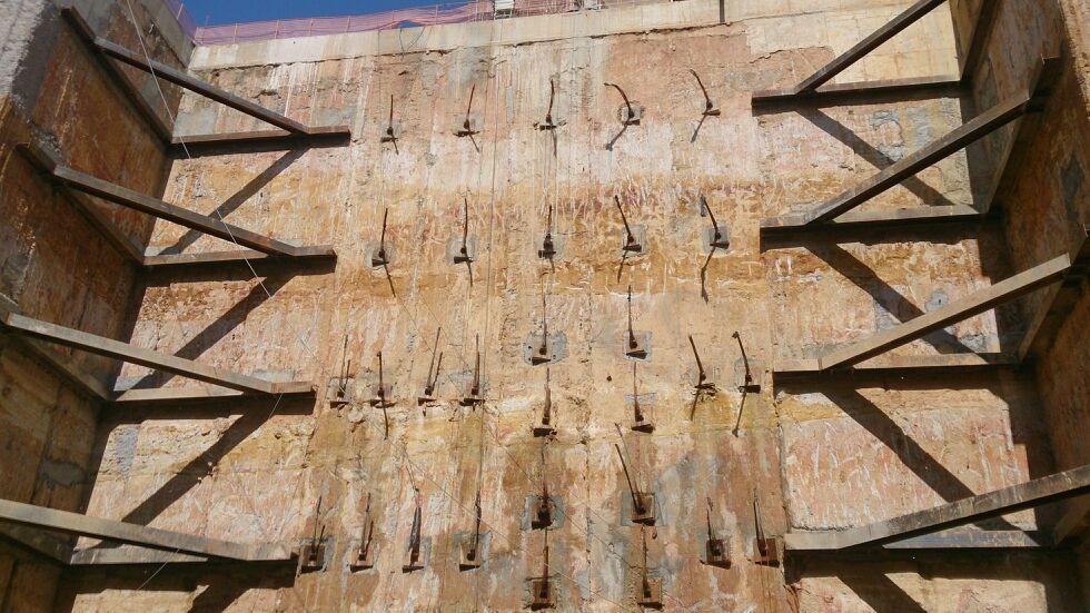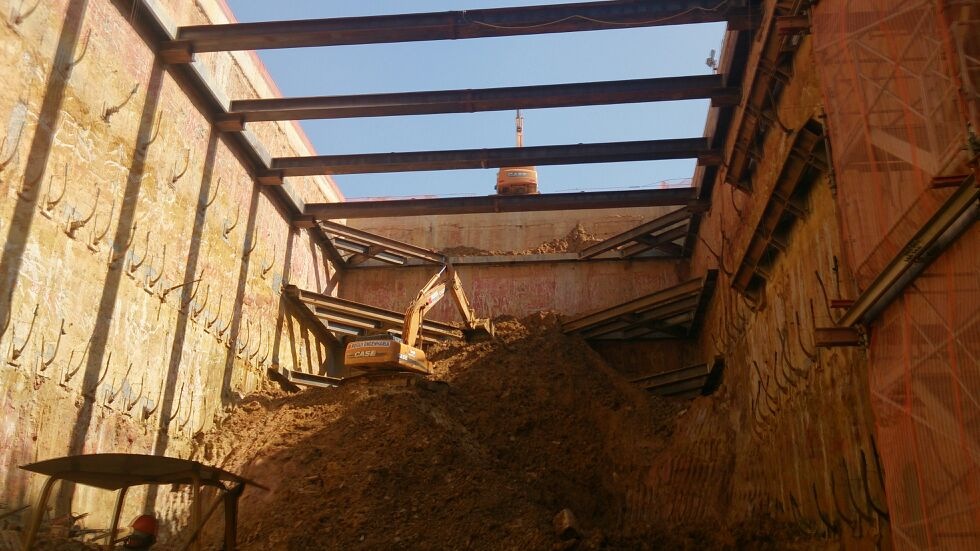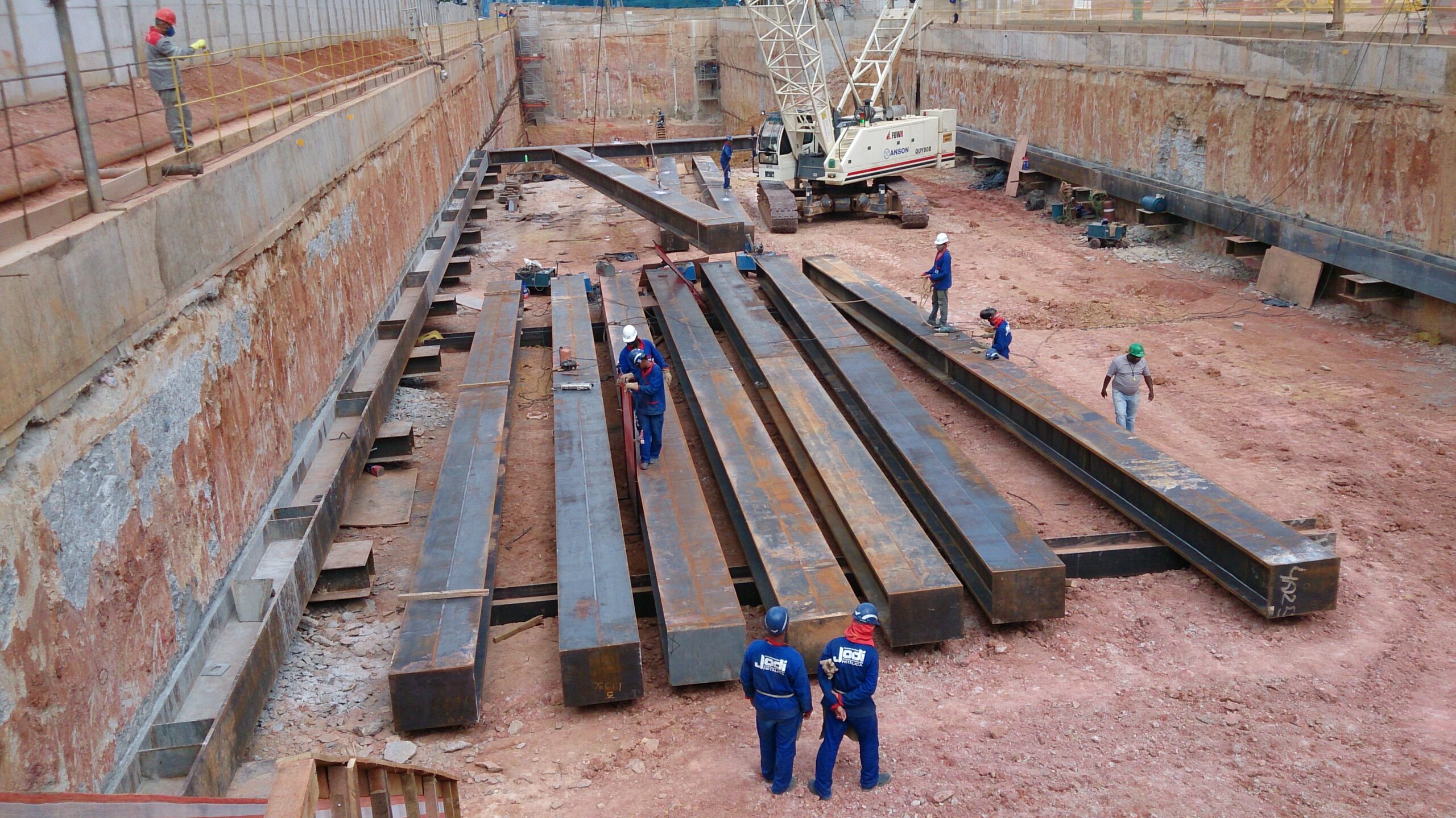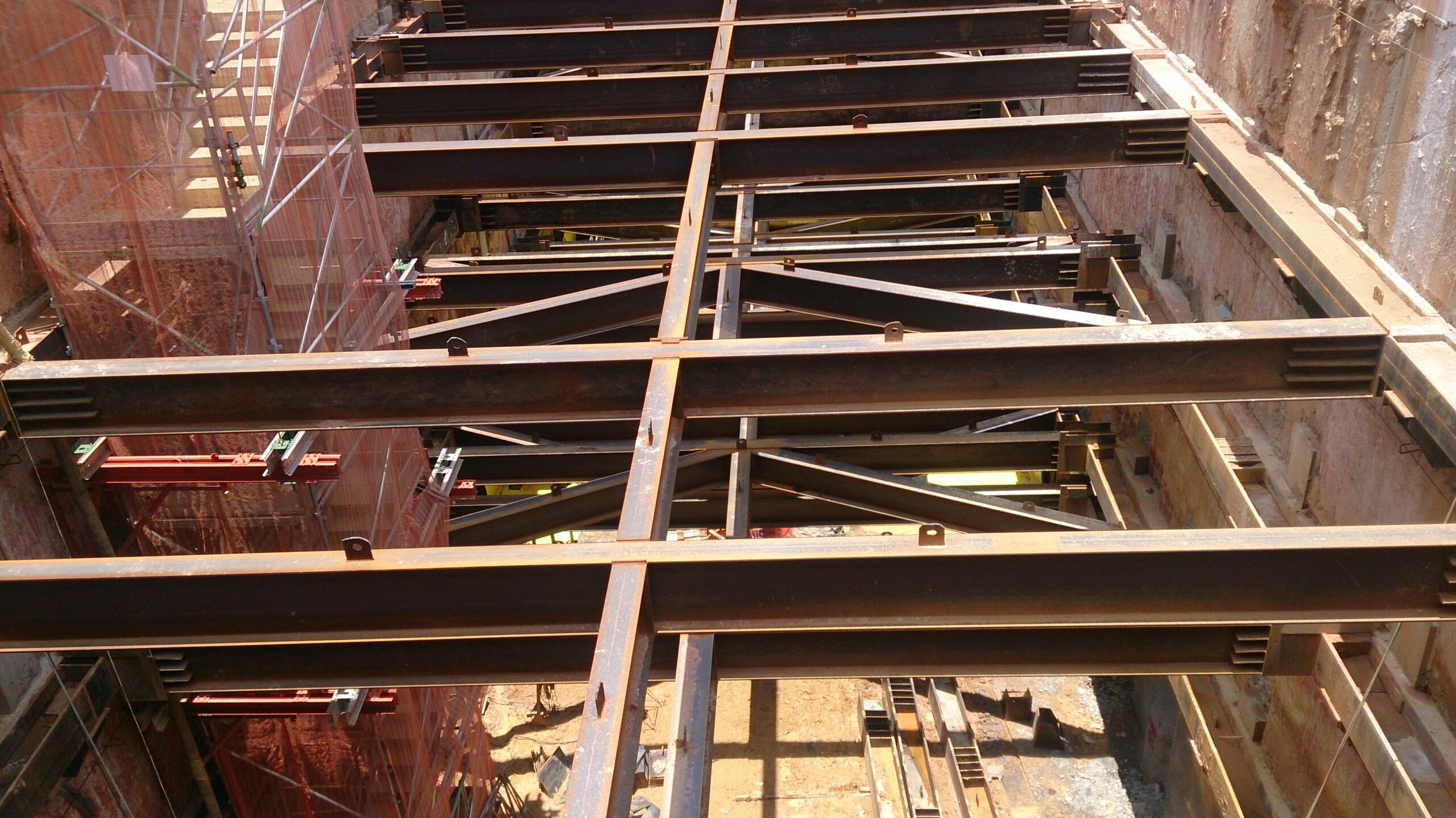 Um dos principais elementos estruturais utilizados foram os estroncamentos metálicos — peças temporárias essenciais para garantir a estabilidade de escavações profundas e estruturas durante a fase construtiva. Eles suportam pressões laterais do solo ou de elementos adjacentes, permitindo que a obra avance com segurança e precisão.