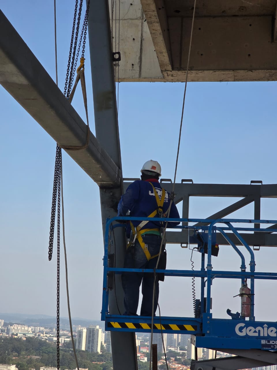 Para viabilizar a montagem, foi necessário o uso de equipamentos especiais, capazes de transportar as peças e conduzir nossa equipe com segurança até os pontos de instalação.