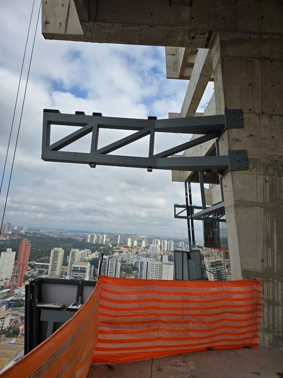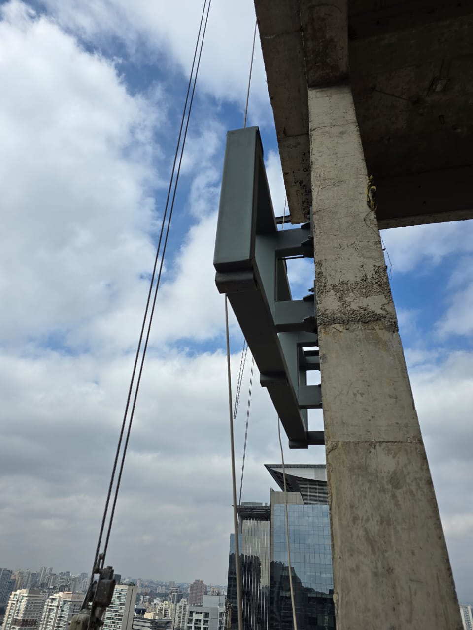 A instalação apresentou alto grau de complexidade, com peças pesadas posicionadas no limite da prumada do edifício — e, em alguns casos, até mesmo projetadas para fora da estrutura.
