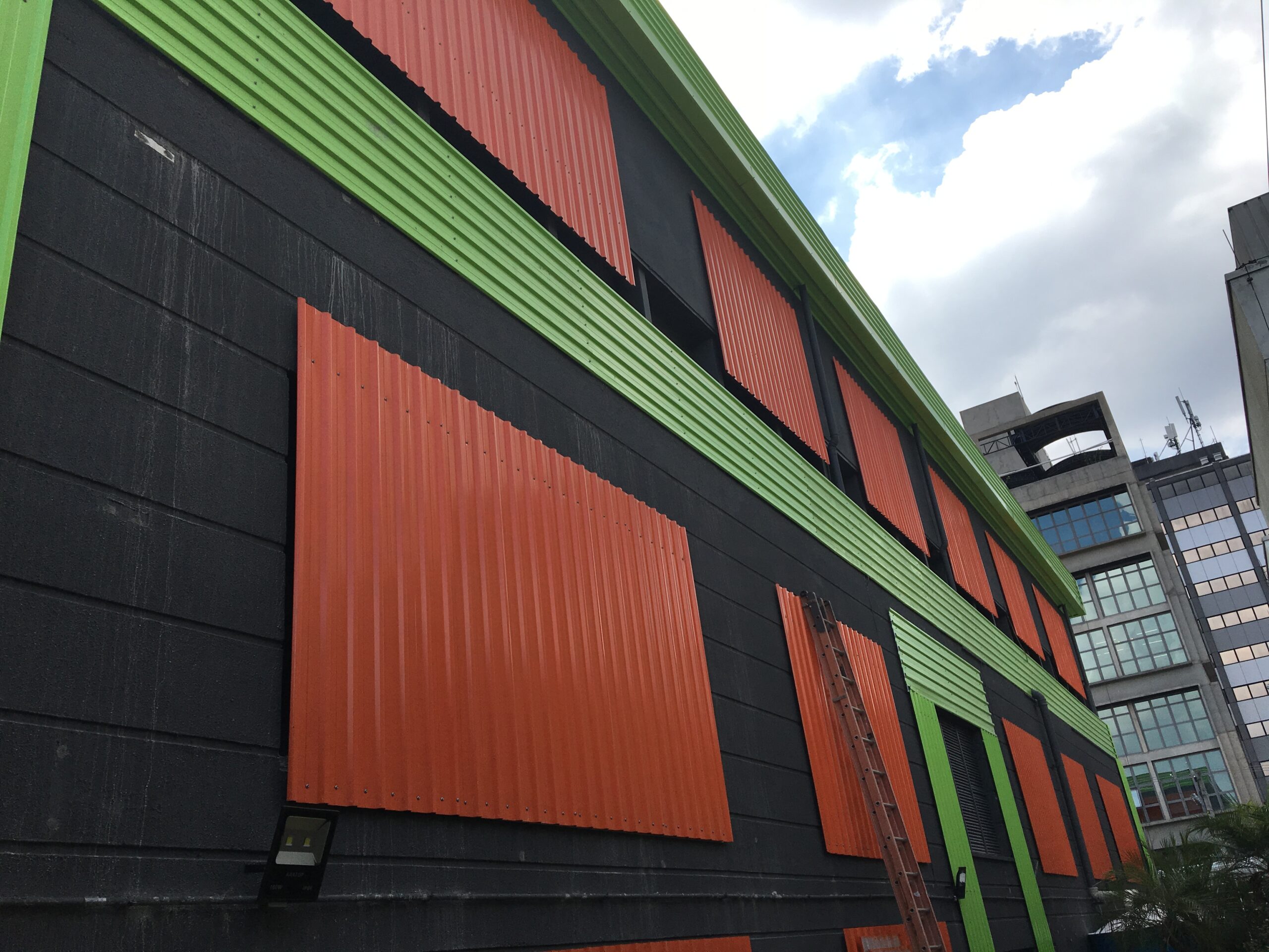 A solução adotada foi composta por perfis metálicos de suporte, fixados diretamente nas paredes estruturais do edifício, e revestidos com telhas trapezoidais, que conferem ritmo visual e identidade ao conjunto.