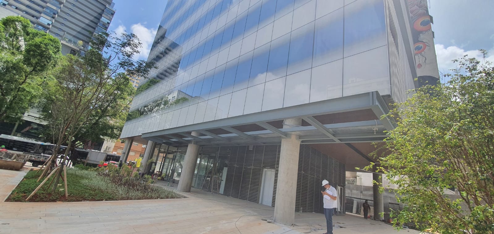 O resultado foi um conjunto arquitetônico imponente e elegante, que valoriza o acesso ao empreendimento e demonstra a precisão técnica da execução.