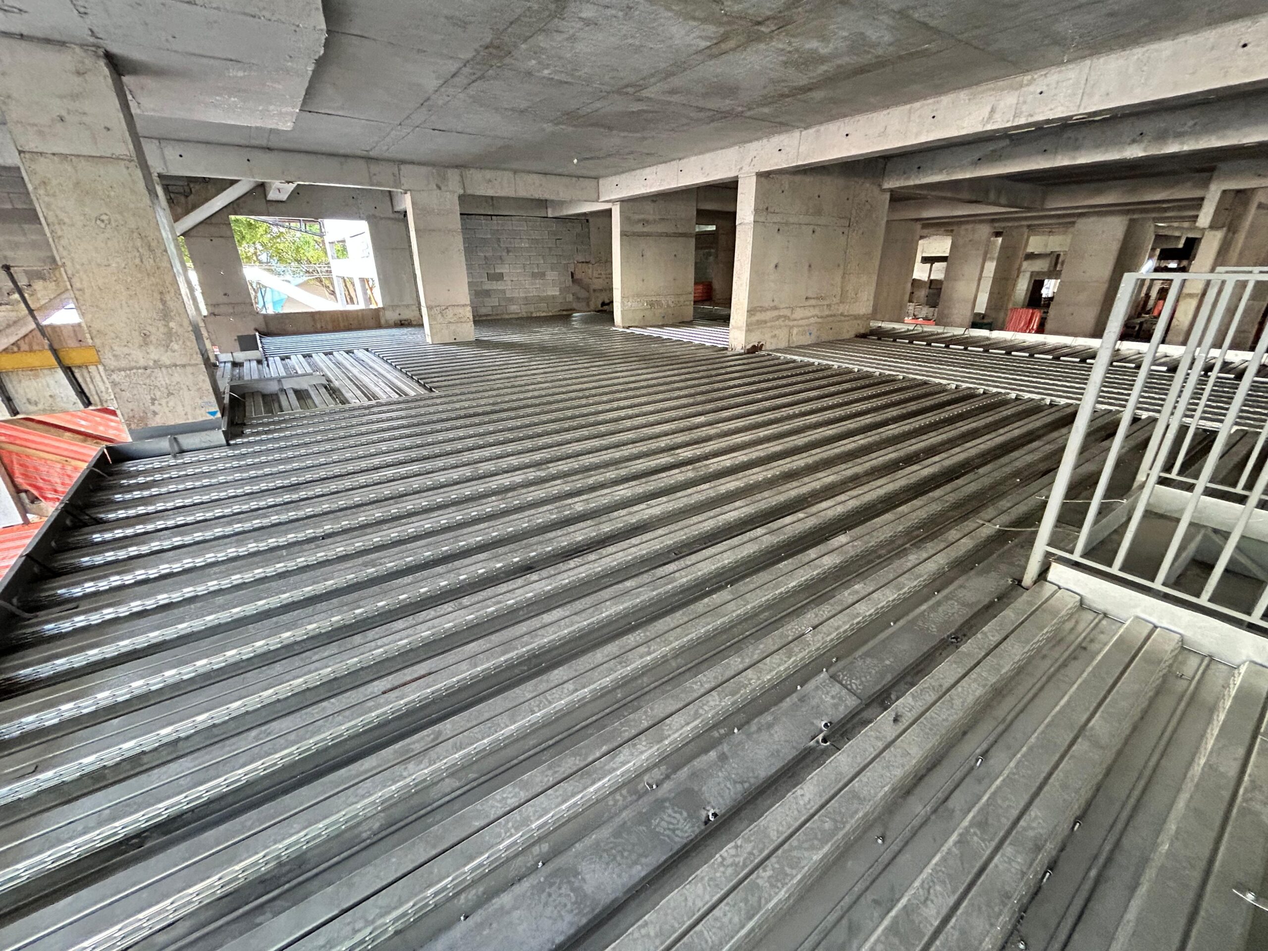 O piso foi executado com steel deck, um sistema de laje mista que combina chapas metálicas com concreto, oferecendo agilidade na execução, leveza e excelente desempenho técnico.