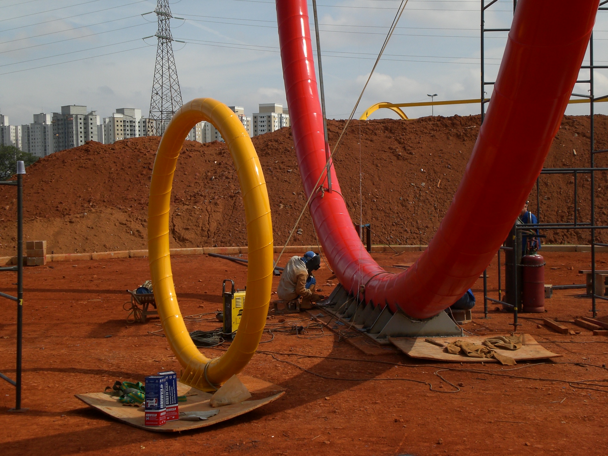 A montagem foi tecnicamente desafiadora devido à grande altura das estruturas em forma de argola, exigindo planejamento e precisão.