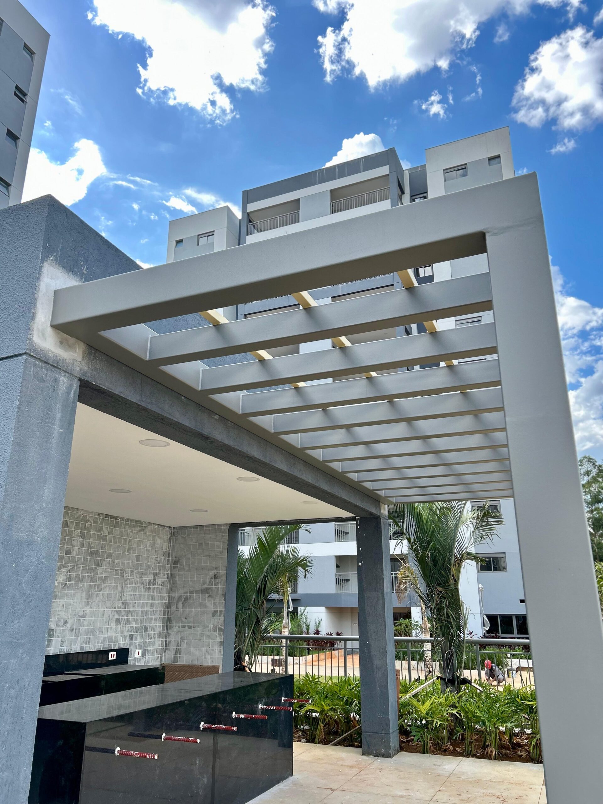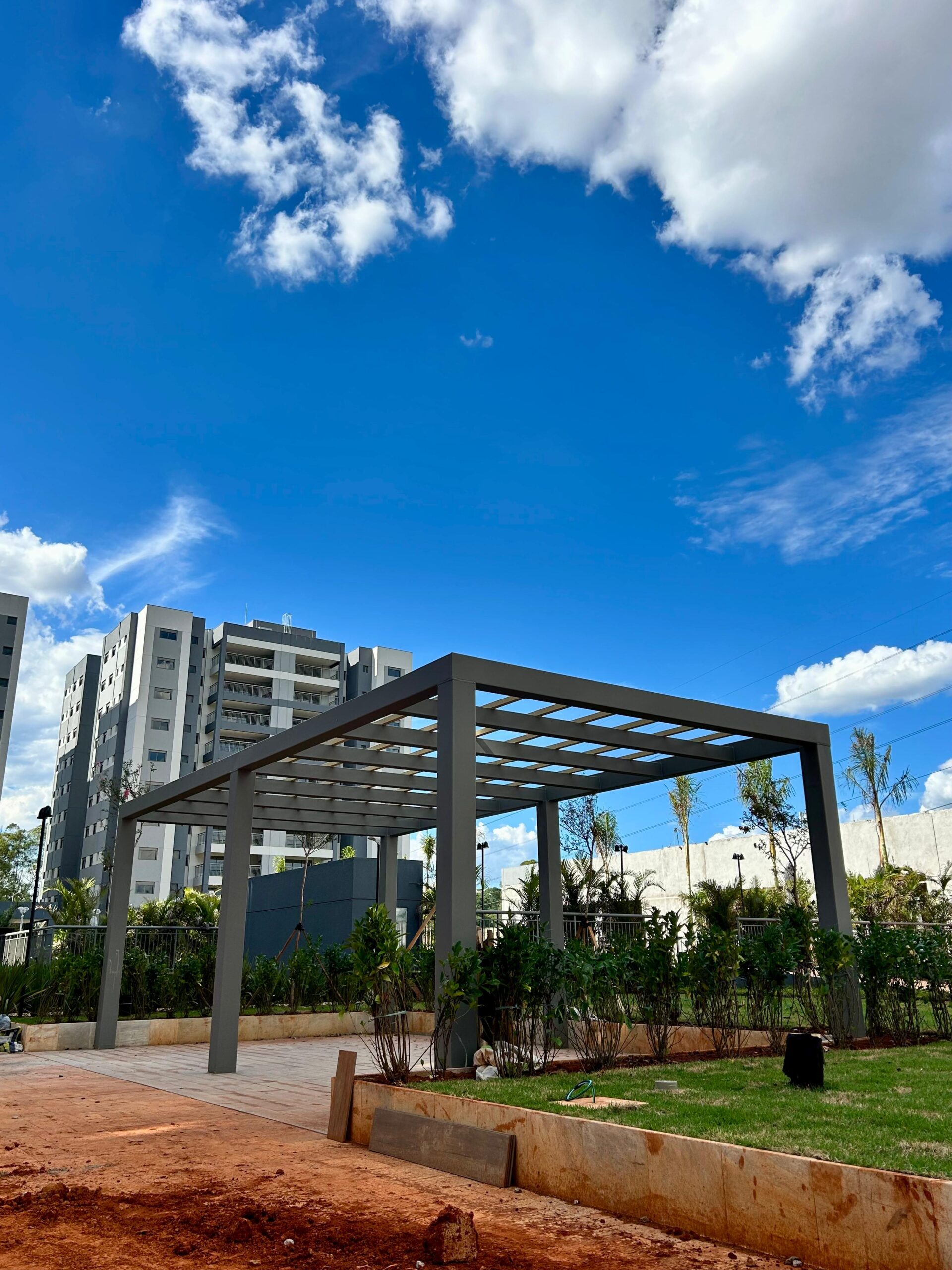 Instalados em espaços amplos, os pergolados trouxeram leveza e harmonia ao ambiente, valorizando a experiência dos moradores.