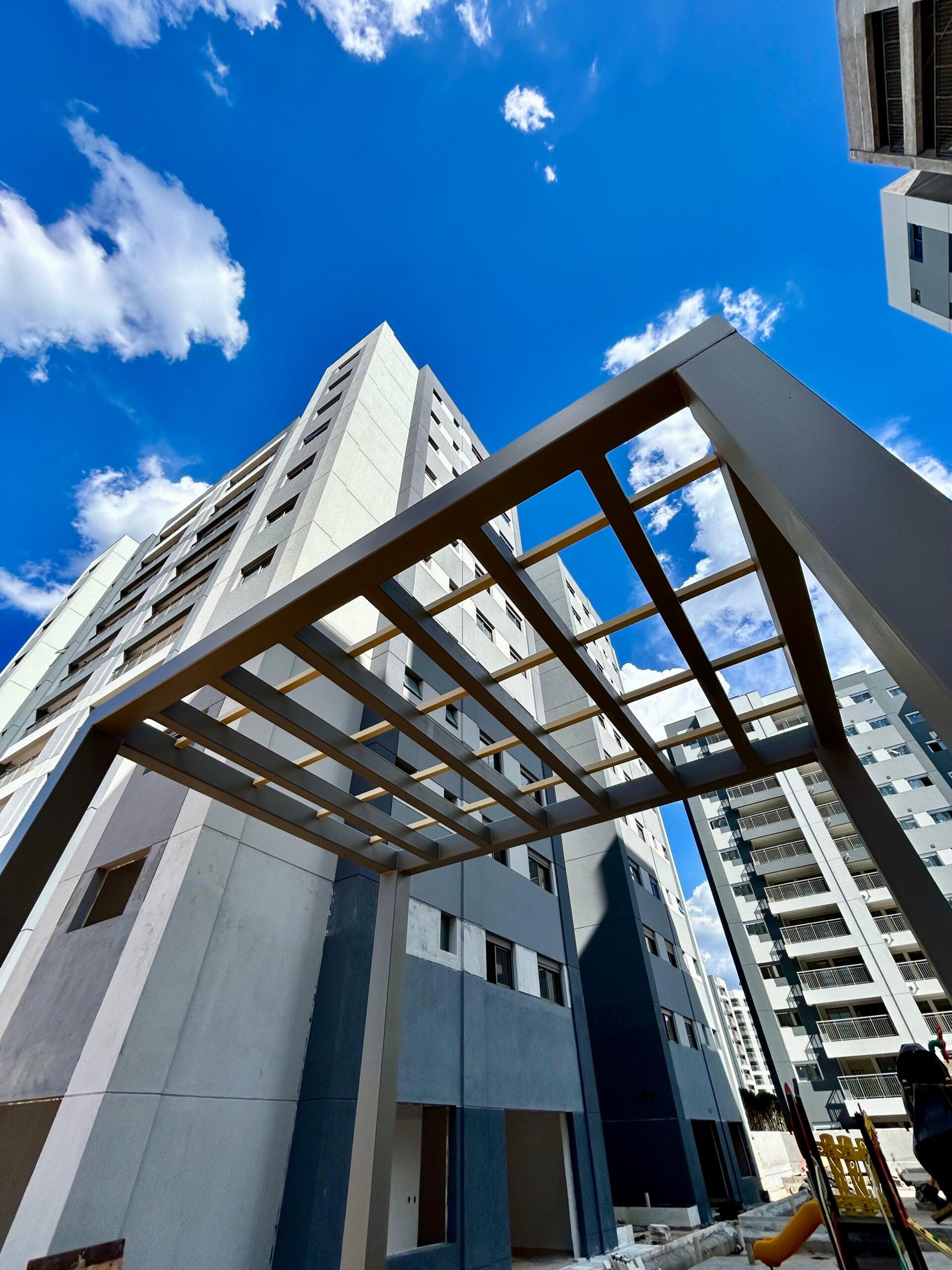 Neste edifício, executamos os pergolados das áreas de convivência, com um design clean e contemporâneo.