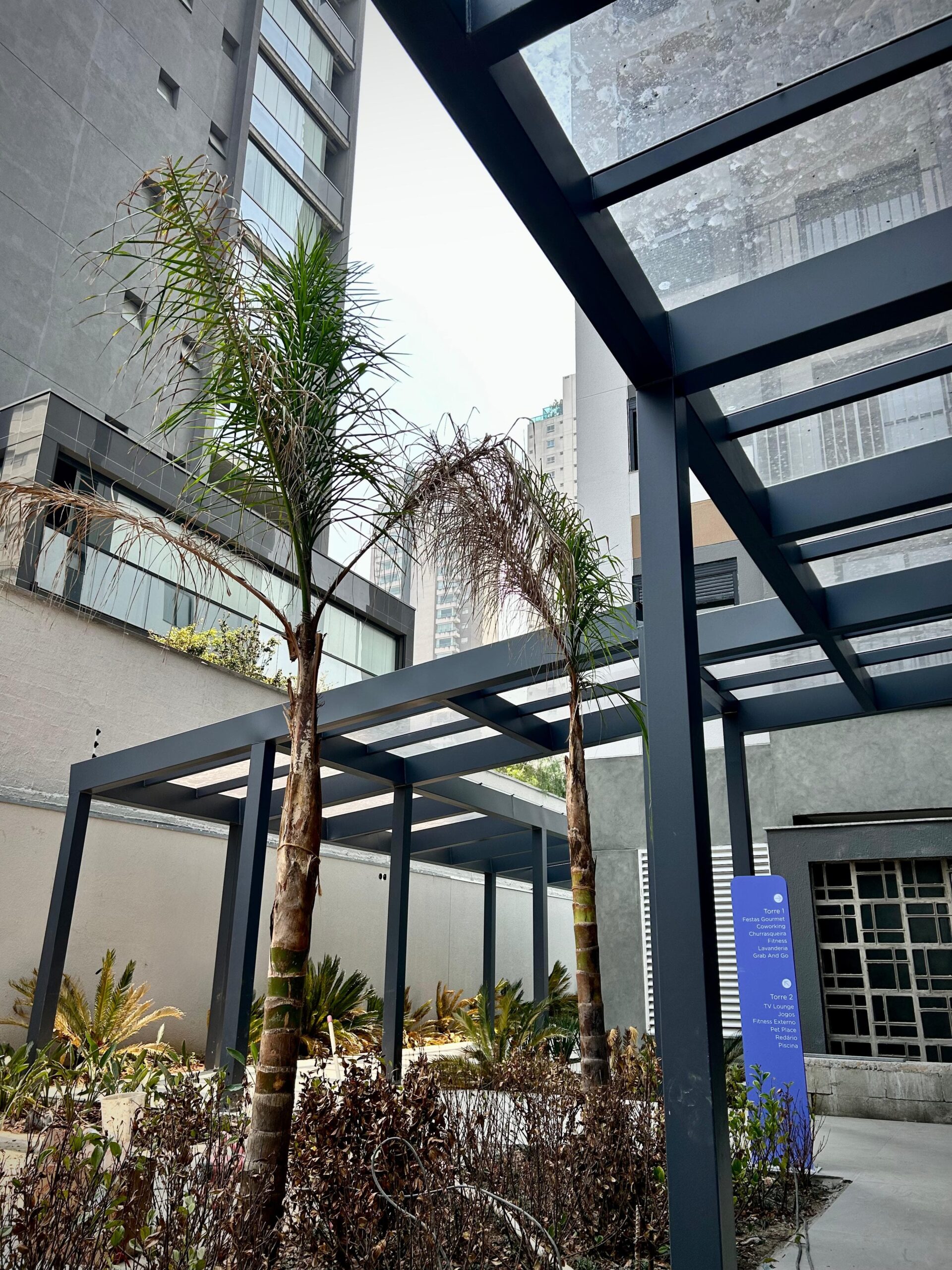 Neste empreendimento, executamos os pergolados metálicos que percorrem todo o complexo do condomínio — da entrada principal até os espaços internos de convivência.