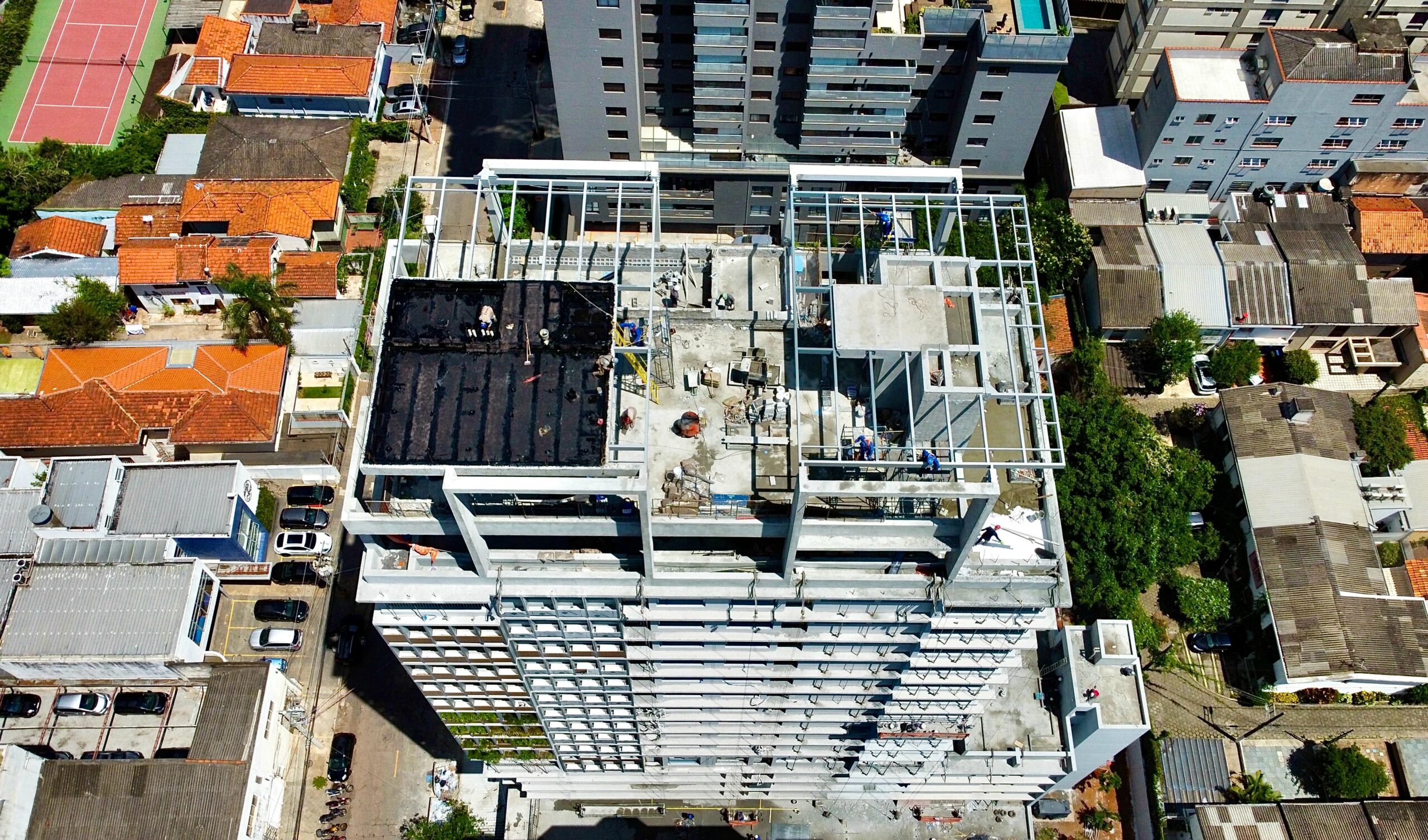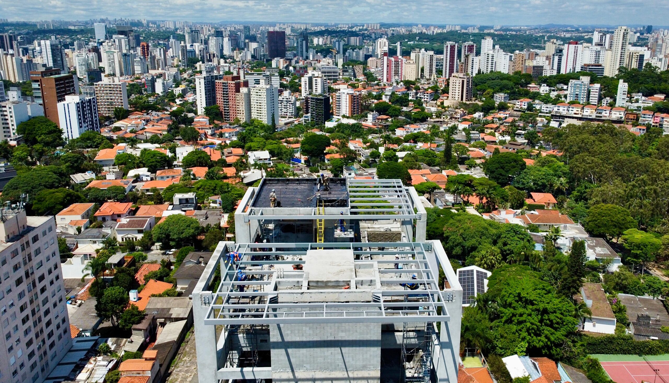 Neste empreendimento, executamos os pergolados metálicos no topo das torres, em um ambiente de alta complexidade técnica.